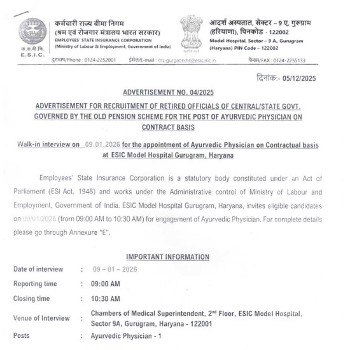 Walk-in Interview for the post of Ayurvedic Physician, ESIC Model Hospital, Haryana.