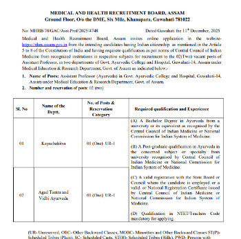 Vacancy for the posts of Assistant Professor (Ayurveda), Govt. Ayurvedic College and Hospital, Guwahati.