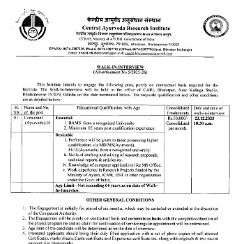 Walk-in Interview for the post of Consultant (Ayurveda), Central Ayurveda Research Institute, Bhubaneswar.