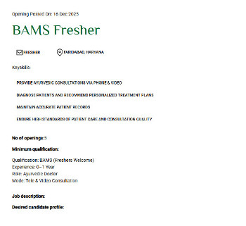 Vacancy for the post of Ayurvedic Doctor (BAMS Fresher), Jiva Ayurveda, Haryana.