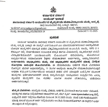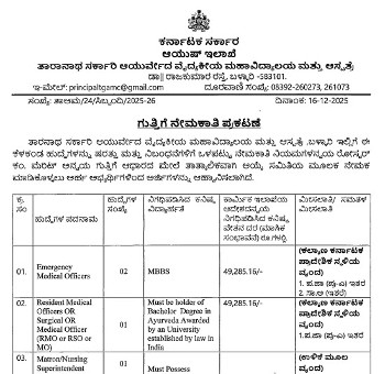Vacancy for the posts of Teaching Faculties, Taranath Government Ayurvedic Medical College, Bellary.