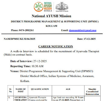 Walk-in Interview for the post of Ayurveda Therapist, National AYUSH Mission, Kollam.