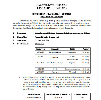 Vacancy for the post of Pharmacist Grade - II (Ayurveda), Kerala Public Service Commission.
