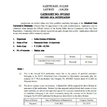Vacancy for the post of Pharmacist Grade - II (Ayurveda), Kerala Public Service Commission, Wayanad.