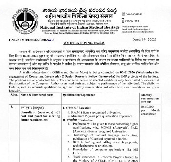 Walk-in Interview for the posts of Consultant & SRF (Ayurveda), National Institute of Indian Medical Heritage, Hyderabad.