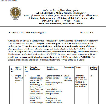 Vacancy for the posts of Project Technical Support, All India Institute of Medical Sciences, Bhubaneswar.