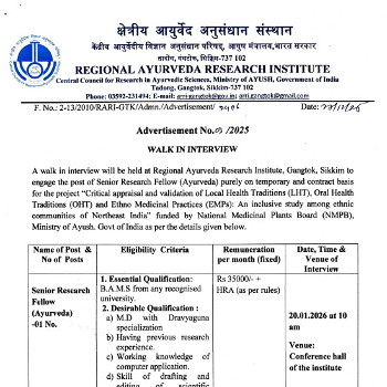 Walk-in Interview for the post of Senior Research Fellow (Ayurveda), Regional Ayurveda Research Institute, Gangtok.