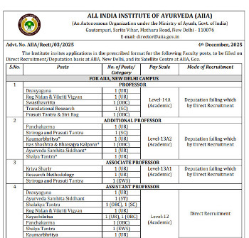 Vacancy for the posts of Ayurveda Faculty, All India Institute of Ayurveda, New Delhi.