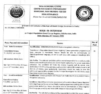 Walk-in Interview for the post of State Co-ordinator, Tata Memorial Centre, Mumbai.