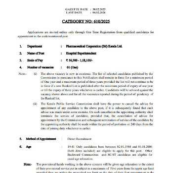 Vacancy for the post of Hospital Superintendent, Kerala Public Service Commission.