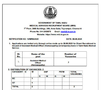 Vacancy for the post of Assistant Medical Officer (Homoeopathy), Tamil Nadu Medical Services Recruitment Board.