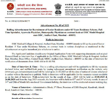 Walk-in Interview for the post of Homeopathy Physician, ESIC Medical College & Hospital, Mumbai.