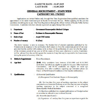 Vacancy for the post of Professor in Homoeopathic Pharmacy, Kerala Public Service Commission.