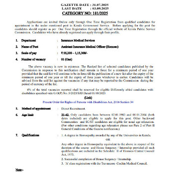 Vacancy for the post of Assistant Insurance Medical Officer (Homeo), Kerala Public Service Commission.