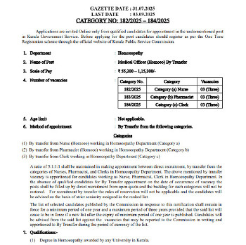 Vacancy for the post of Medical Officer (Homeo), Kerala Public Service Commission.
