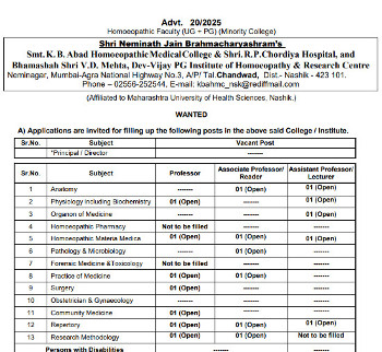 Vacancy for the post of Homoeopathic Faculty, Smt. K.B. Abad Homoeopathic Medical College & Dev-Vijay PG Institute.