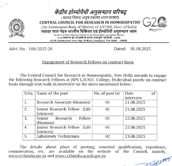 Walk-in Interview for the post of Junior/Senior Research Fellow (Homoeo), Central Council for Research in Homoeopathy, New Delhi.