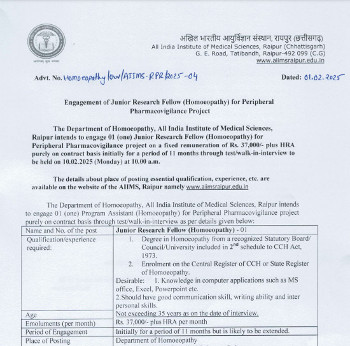 Walk-in-Interview for the post of Junior Research Fellow (Homoeopathy), All India Institute of Medical Sciences, Raipur.