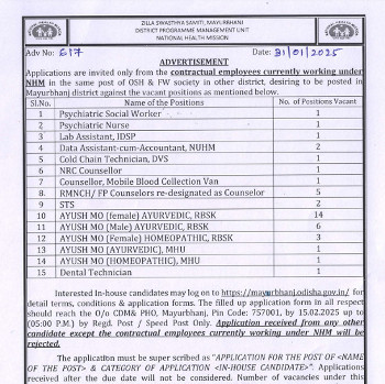 Vacancy for Various Homeo posts, National Health Mission, Mayurbhanj.