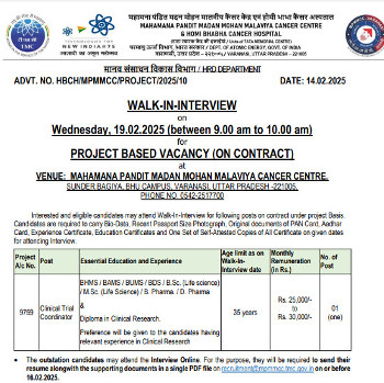 Walk-in-Interview for the post of Clinical Trial Coordinator Homeo, TMC-Mahamana Pandit Madan Mohan Malaviya Cancer Centre, Varanasi.