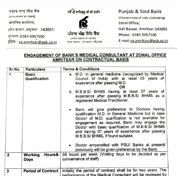 Vacancy for the post of Medical Consultant Homeo, Punjab & Sind Bank.