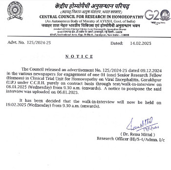 Walk-in-Interview for the post of Senior Research Fellow Homeo, Central Council for Research in Homoeopathy, New Delhi.