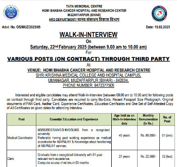 Walk-in-Interview for the post of Medical Coordinator Homeo, TMC-Homi Bhabha Cancer Hospital and Research Centre, Bihar.