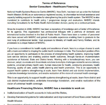 Vacancy for the post of Senior Consultant - Healthcare Financing Homeo, National Health Systems Resource Centre, New Delhi.