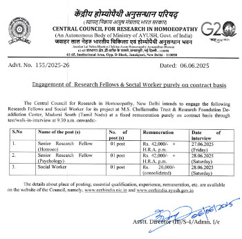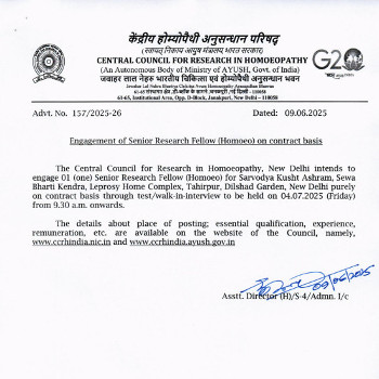 Walk-in-Interview for the post of Senior Research Fellow (Homeo), Central Council for Research in Homoeopathy, New Delhi.