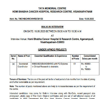 Walk-in-Interview for the post of Secretarial Coordinator (Homeo), TMC-Homi Bhabha Cancer Hospital & Research Centre, Visakhapatnam.