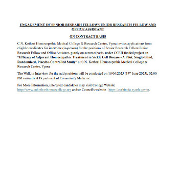 Walk-in-Interview for the posts of Senior Research Fellow & Junior Research Fellow (Homeo), C.N Kothari Homoeopathic Medical College and Research Centre, Gujarat.
