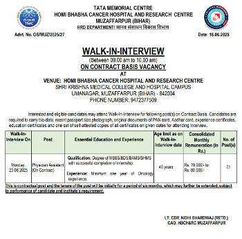 Walk-in-Interview for the post of Physician Assistant (Homeo), TMC-Homi Bhabha Cancer Hospital And Research Centre, Bihar.