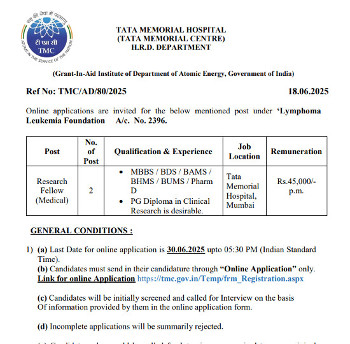 Vacancy for the post of Research Fellow (Homeo), Tata Memorial Centre, Mumbai.