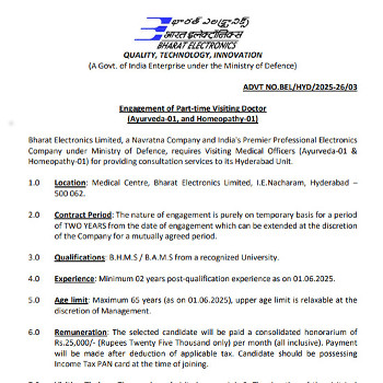 Vacancy for the post of Visiting Medical Officers (Homeo), Bharat Electronics Limited, Hyderabad.