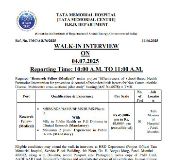 Walk-in-Interview for the post of Research Fellow (Medical) (Homeo), Tata Memorial Centre, Mumbai.