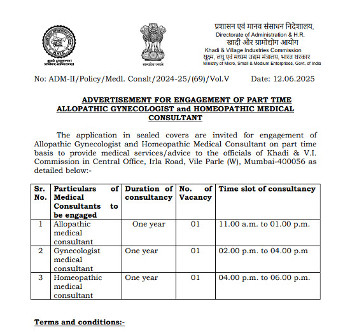 Vacancy for the post of Homeopathic Medical Consultant, Khadi & Village Industries Commission, Mumbai.