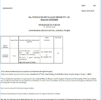 Walk-in-Interview for the post of Tutor Homeo, TMC-Homi Bhabha Cancer Hospital, Punjab.