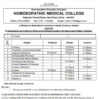 Vacancy for the post of Homoeopathic Faculty, Homeopathic Medical College, Akola.