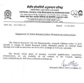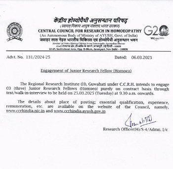 Walk-in-Interview for the post of Junior Research Fellow (Homeo), Regional Research Institute for Homoeopathy, Guwahati.