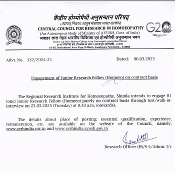 Walk-in-Interview for the post of Junior Research Fellow (Homeo), Regional Research Institute for Homoeopathy, Shimla.