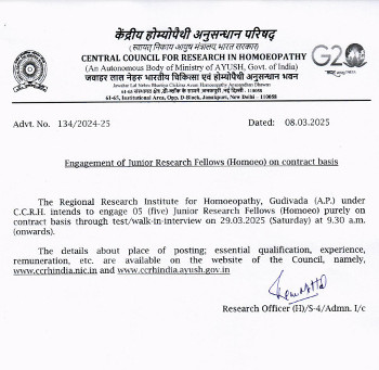 Walk-in-Interview for the post of Junior Research Fellows (Homeo), Regional Research Institute for Homoeopathy, Gudivada.