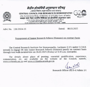 Walk-in-Interview for the post of Junior Research Fellows (Homeo), Central Research Institute for Homoeopathy, Lucknow.