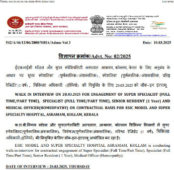 Walk-in-Interview for the post of Medical Officer Homeopathy, Employees State Insurance Corporation, Kollam.