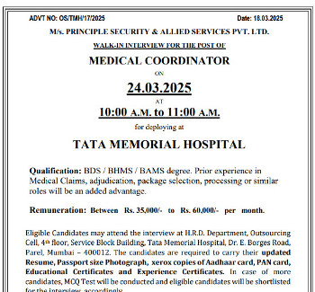 Walk-in-Interview for the post of Medical Coordinator Homeo, Tata Memorial Hospital, Mumbai.