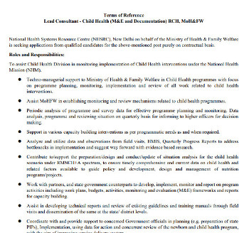 Vacancy for the post of Lead Consultant - Child Health Homeo, National Health Systems Resource Centre, New Delhi.