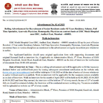 Walk-in-Interview for the post of Homeopathy Physician, Employees State Insurance Corporation, Mumbai.