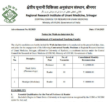 Walk-in-Interview for the post of Contractual Teaching Faculty (Unani), Regional Research Institute of Unani Medicine, Srinagar.