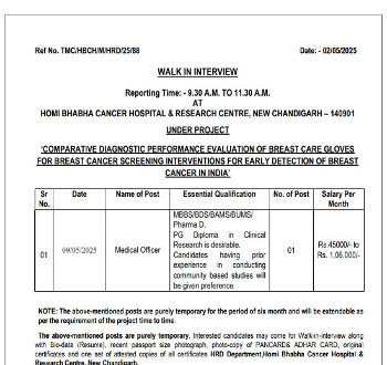 Walk-in-Interview for the post of Medical Officer Unani, TMC-Homi Bhabha Cancer Hospital & Research Centre, Chandigarh.