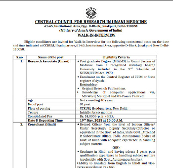 Walk-in-Interview for the post of Research Associate (Unani), Central Council for Research in Unani Medicine, Delhi.