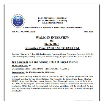Walk-in-Interview for the post of Research Fellow Unani, Tata Memorial Centre, Mumbai.